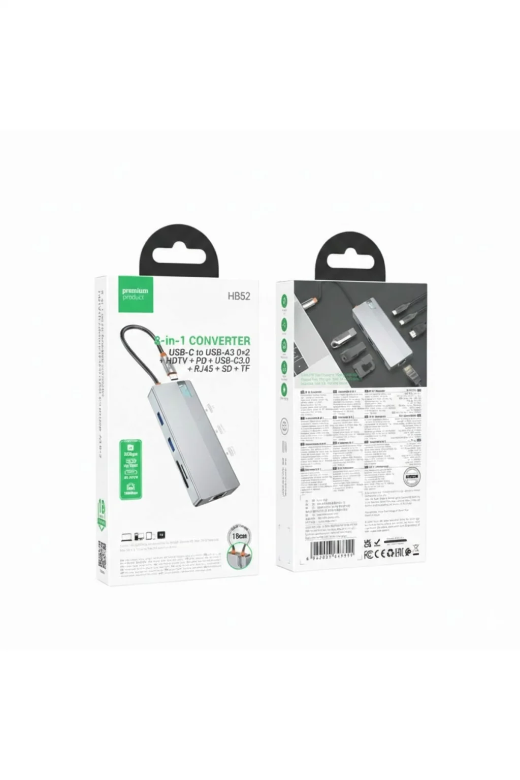 HB52 8’i 1 arada adaptör, çok yönlülüğü ve yüksek performansı önemseyenler için mükemmel bir aksesuardır. Bu adaptör, Type-C portu olan cihazınızın özelliklerini genişleterek onu güçlü bir çalışma istasyonuna dönüştürür. HDMI ile harici monitör bağlayabilir, RJ45 üzerinden internete erişebilir, SD/TF hafıza kartlarını okuyabilir ve iki USB 3.0 ile bir Type-C 3.0 portu aracılığıyla veri aktarımı yapabilirsiniz. Ayrıca, adaptör Power Delivery (PD) ile hızlı şarj desteği de sunar. Tüm bu özellikler, kompakt ve şık bir tasarımda bir araya getirilmiştir.
