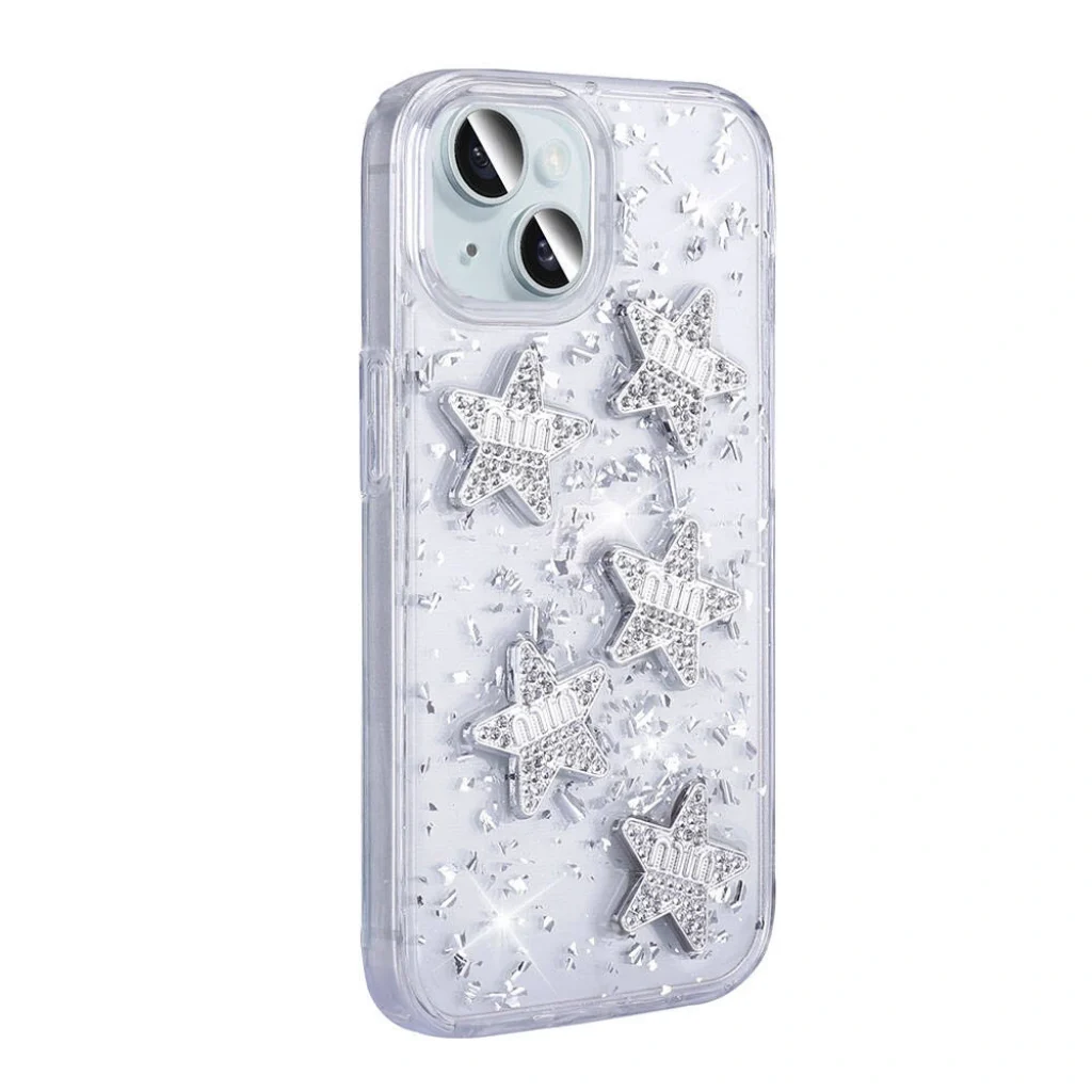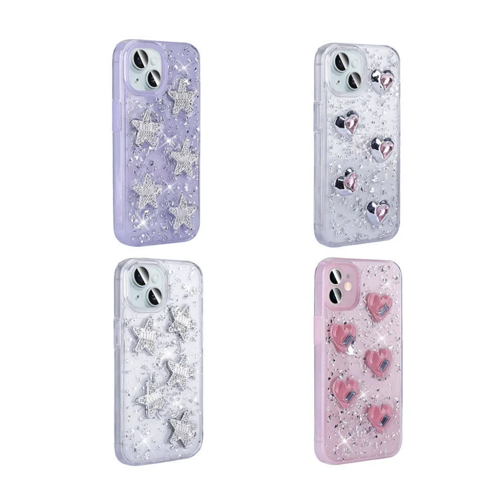 Kalp, yıldız ve fiyonk şekilleriyle birlikte simli tasarım, parıltılı şık arka yüzey yapısı.
