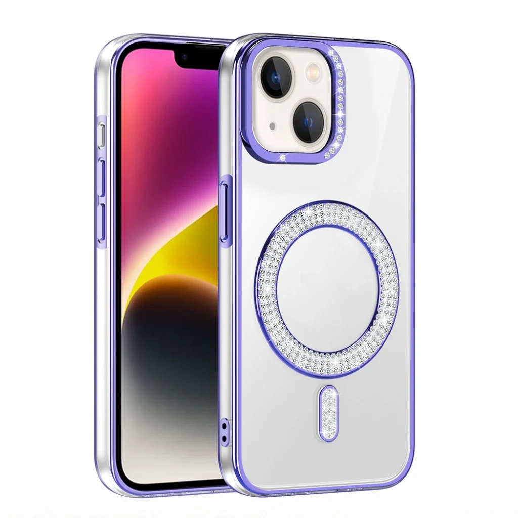 iPhone 14 Kılıf Pırlanta Taş Tasarımlı M-safe Şarj Özellikli Karetta Silikon Kapak