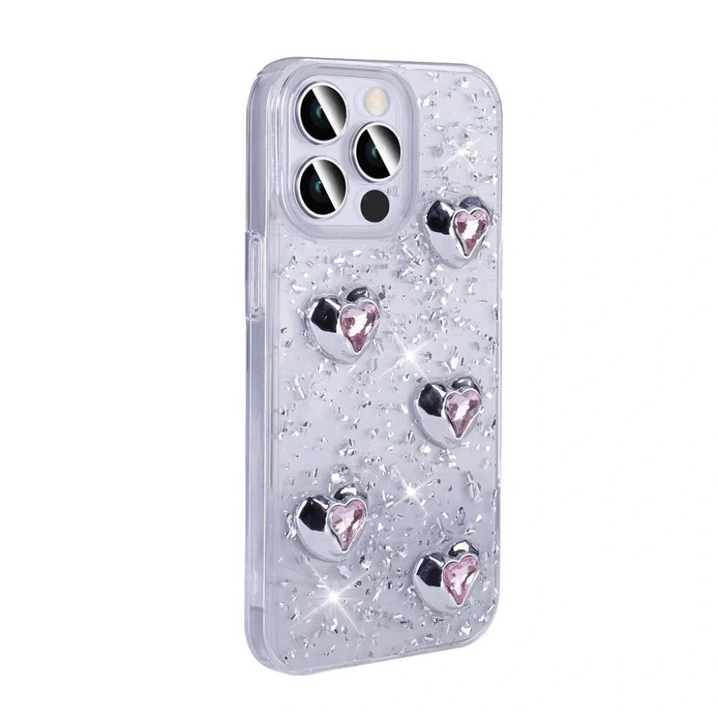 Kalp, yıldız ve fiyonk şekilleriyle birlikte simli tasarım, parıltılı şık arka yüzey yapısı.