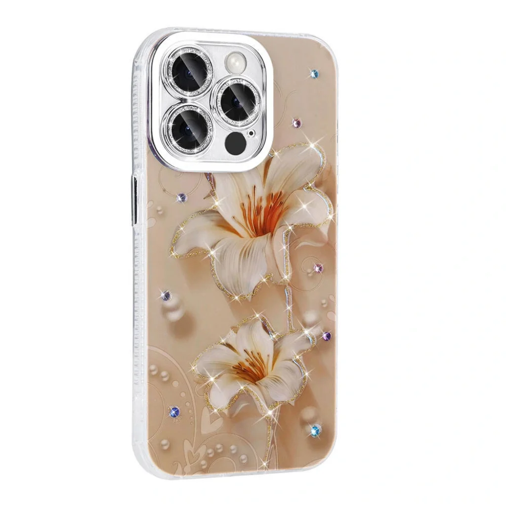 iPhone 14 Pro Max Kılıf Çiçek Desenli Parlak Taşlı Sert Silikon Garden Kapak