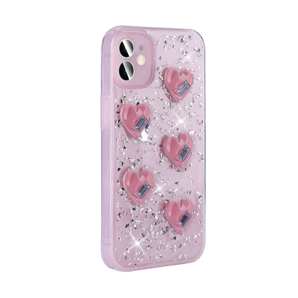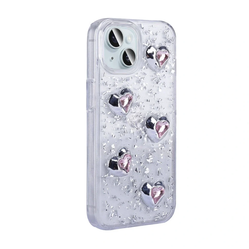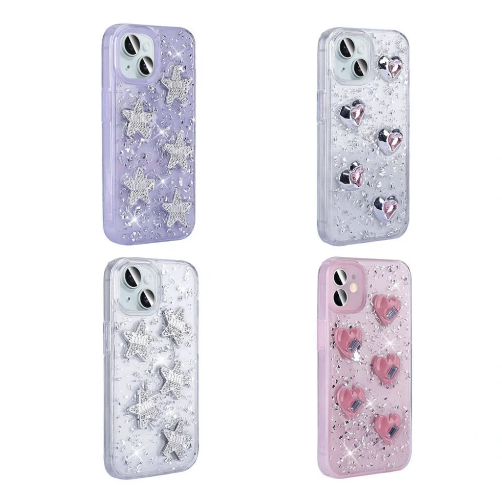 Kalp, yıldız ve fiyonk şekilleriyle birlikte simli tasarım, parıltılı şık arka yüzey yapısı.
