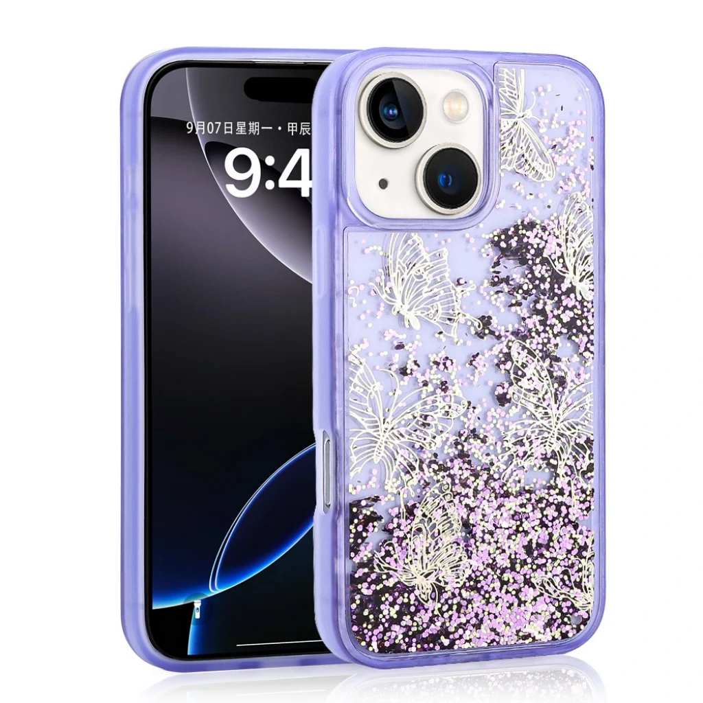 iPhone 15 Kılıf Sıvılı Simli Kelebek Baskılı Şeffaf Arka Yüzey Zore Glis Silikon Kapak