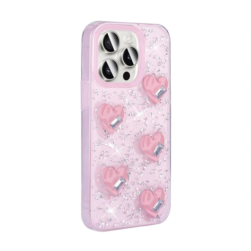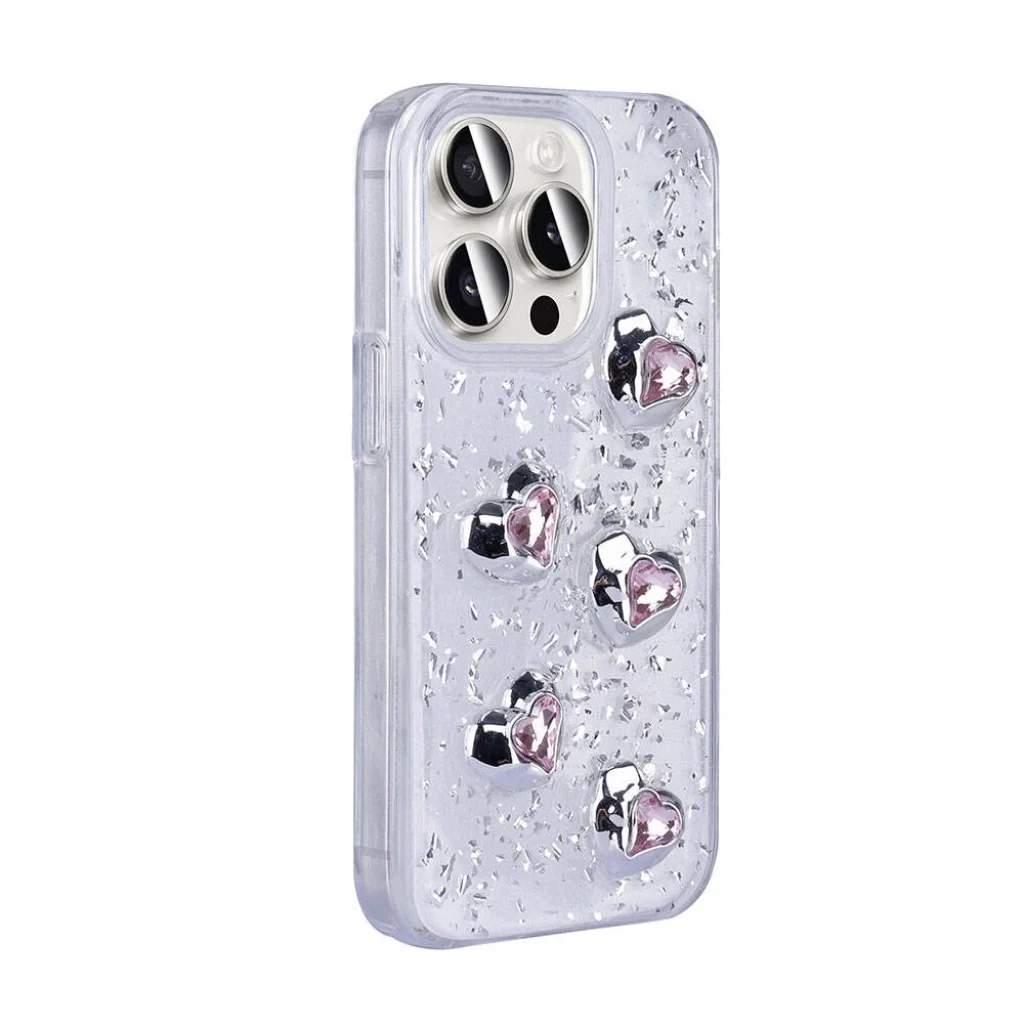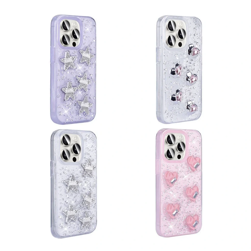 Kalp, yıldız ve fiyonk şekilleriyle birlikte simli tasarım, parıltılı şık arka yüzey yapısı.