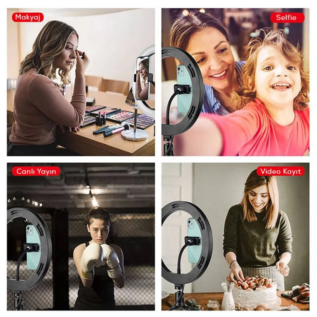 360° dönebilen pan tilt başlığı ile ışık açısını serbestçe ayarlayabilir, anti-skid mobil ve kaymaz silikon ped tasarımı sayesinde cihazlarınızı güvenle kullanabilirsiniz. Ekstra uzun kablosu ve ağır hizmet tipi başparmak vidaları ile her türlü çekim ortamında rahatça kullanabileceğiniz bu ring light, dış mekan fotoğrafçılığı, portre, moda, düğün sanatı, reklam fotoğrafçılığı ve video çekimlerinde geniş uygulama alanına sahiptir.